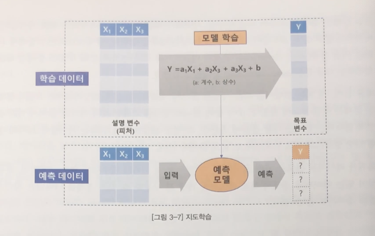 지도학습은 학습 과정에서 정답 Y가 주어진다. 즉, 입력 데이터 X와 출력 데이터 Y를 모두 알고 있는 상태에서 Y=aX+b와 같이 X와 Y사이의 관계식을 알아내는 머신러닝 알고리즘을 말한다. 이때 예측 목표가 되는 Y 변수를 목표 변수(Target)라고 하고, 목표 변수를 예측하는데 사용되는 X변수를 설명 변수(feature)라고 부르기도 한다.