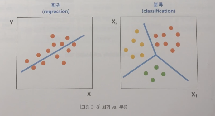 이 책에서는 지도학습을 주로 다루는데 지도학습은 회귀(Regression)와 분류(Classification)으로 유형을 나눌 수 있다.